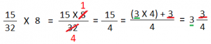 Wir stellen fest das ein Anteil von fünfzehn zweiundreisigstel verspeißt wurde, also etwas weniger als die Hälfte und wollen nun wissen welcher Anzahl an Pizzen das entspricht dafür multiplizieren wir den errechneten Anteil mit der Gesamtmenge an Pizzen.