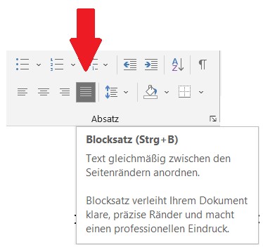 2. Wählen Sie in der oberen Leiste im Abschnitt „Absatz“ das Symbol „Blocksatz“ (roter Pfeil)