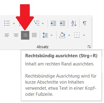 2. Wählen Sie in der oberen Leiste im Abschnitt „Absatz“ das Symbol „Rechtsbündig ausrichten“ (roter Pfeil)