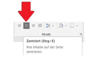 2. Wählen Sie in der oberen Leiste im Abschnitt „Absatz“ das Symbol „Zentriert“ (roter Pfeil)